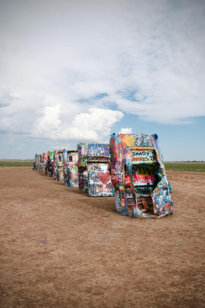 Entering Texas, make a quirky stop at Cadillac Ranch near Amarillo. This public art installation features colorful, graffiti-covered Cadillacs buried nose-first in the ground, making it an excellent photo op.